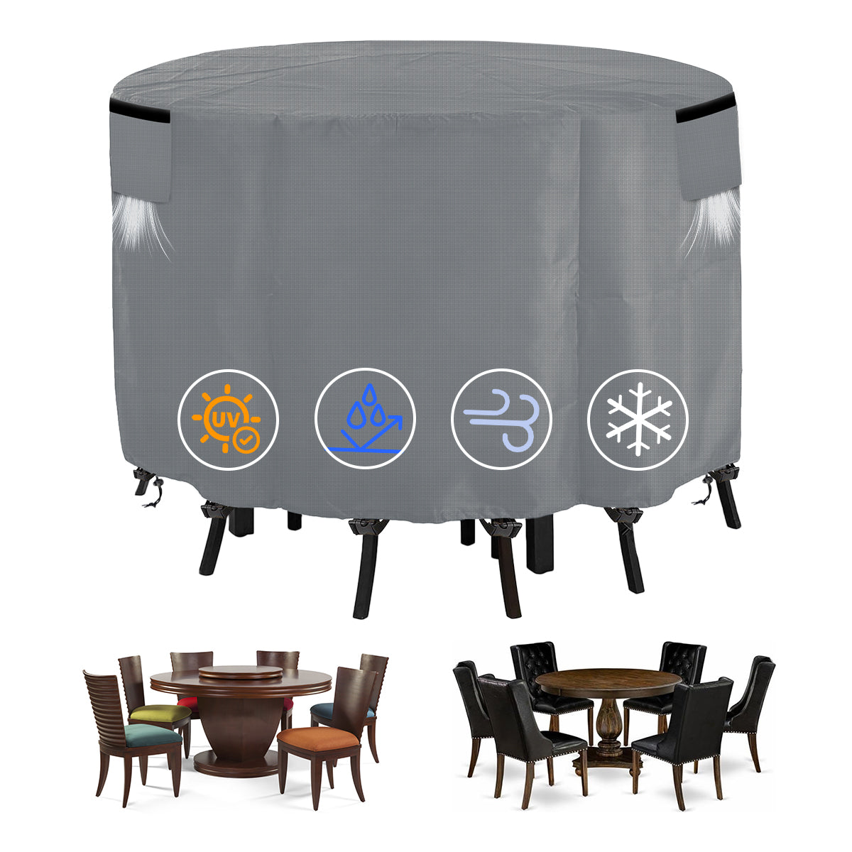 【ALL-WEATHER PROTECTION】: Our outdoor table covers are designed to be waterproof, UV resistant, and windproof. Waterproof adhesive strips are added to the seams of the fabric, and the Patio furniture cover is made of 210T gray polyester taffeta, Whether it's rain or wind, it can protect your outdoor furniture from the harsh conditions!